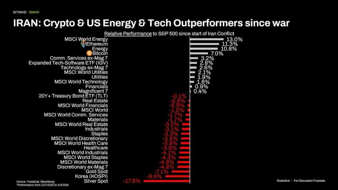 值得注意的是,这个规律从伊朗战事爆发以来一直成立。自 2 月 27 日战事开始至 4 月 3 日,相对标普 500 的超额收益排名中,前四名分别是 MSCI 全球能源(+13.0%)、以太坊(+11.3%)、美国能源板块(+10.8%)和比特币(+7.0%)。