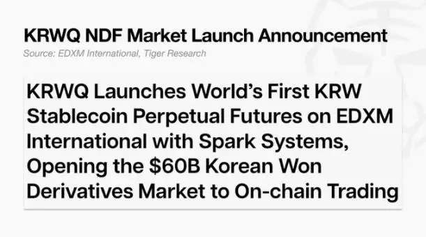 韩元现金公司旨在通过永续合约来解决这些限制。无本金交割远期与永续合约在结构上是相同的产品:均不直接兑换韩元,均以美元基于价格差额进行结算,均可用于对冲或对韩元汇率风险进行方向性投注。两者唯一的区别在于到期日:无本金交割远期有固定的到期日,而永续合约没有到期日,可以全天候在链上运行,并以更低的成本提供相同的功能。近期,KRWQ 已通过 EDXM International 推出了一个无本金交割远期市场。