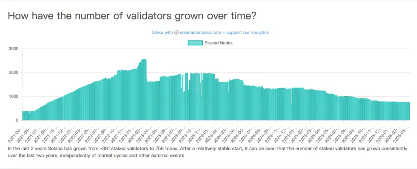 Solana 节点数量已较历史高点下降七成。4月初,据Solana Compass数据显示,其验证者数量从2023年3月的2560个锐减至约756个;同期,中本聪系数从31下滑至20,降幅达35%,去中心化程度同步走弱。