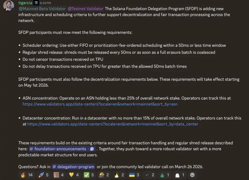 与此同时,规则还进一步收紧了验证者在执行层的自由度。包括要求在50毫秒内完成交易排序、按既定规则处理交易优先级,强制按节奏释放数据分片,并明确禁止对TPU接收的交易进行审查或延迟。这一系列约束,直指过去长期存在的MEV争夺和执行不透明问题,本质上是在压缩验证者的“操作空间”,用更标准化的规则换取网络的一致性。