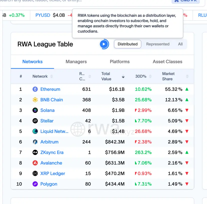 根据RWA.xyz的数据,以太坊在RWA资产价值上仍占据主导地位,链上部署资产超160亿美元,市场份额超55%;BNB Chain以35亿美元、12.13%的份额位居第二;Solana以约19亿美元、6.65%的份额排名第三。机构端的大型代币化国债及私人信贷平台,多数仍部署在以太坊生态。
