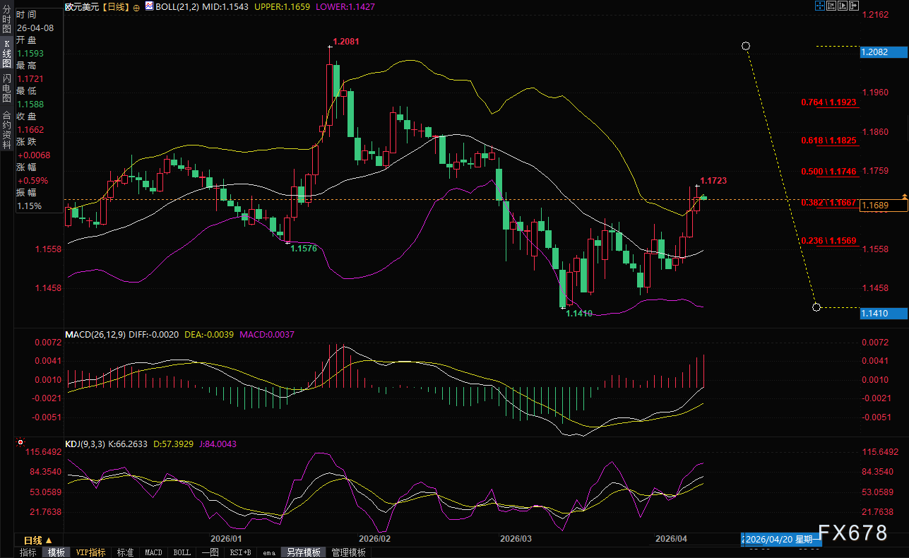 FXStreet欧洲时段首席分析师Eren Sengezer从技术角度给出判断:欧元兑美元短期技术面已呈现明显看涨倾向。日线图上,相对强弱指数(RSI)自美伊冲突爆发以来首次站上50关口,同时汇价成功突破持续两个月的下降趋势线。下一重要阻力位位于2月至4月跌势的斐波那契50%回撤位1.1746,进一步上行目标为1.1825(61.8%回撤位)和1.1923(78.6%回撤位)。下行方面,关键支撑位于1.1667(38.2%回撤位),若失守则可能打开通往1.1569乃至1.1500整数关口的下跌空间。
