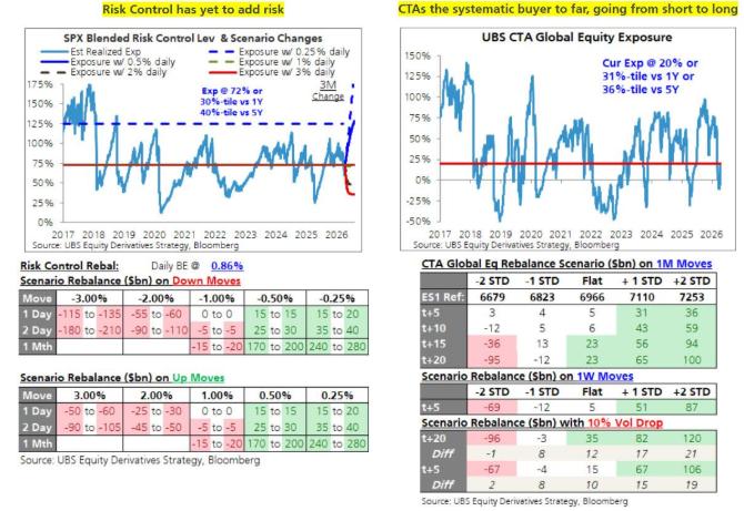 风险控制类策略(Risk Control)目前尚未成为有效买家,受制于近期较高的已实现波动率,其敞口环比基本持平。不过,瑞银测算,若标普500未来走势趋于平稳、日均波动收窄至正负50个基点以内,风险控制类策略在未来一个月内可能买入约1850亿美元。