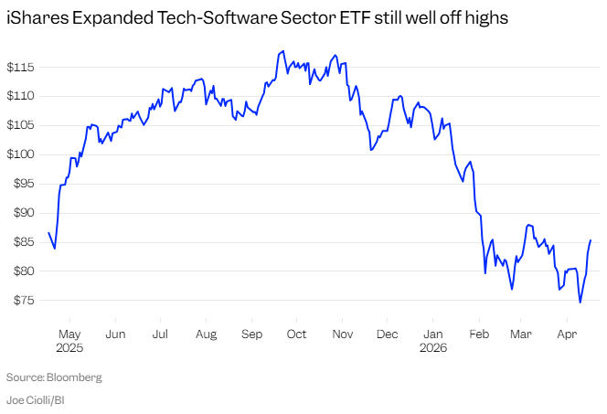 但另一方面,软件股距离前期高点仍有相当距离,这也表明投资者并没有忘记此前对这一板块的担忧。虽然AI交易重新全面回归市场主线,但这对那些此前被视为最容易受到AI替代冲击的行业来说,并不完全是好消息。