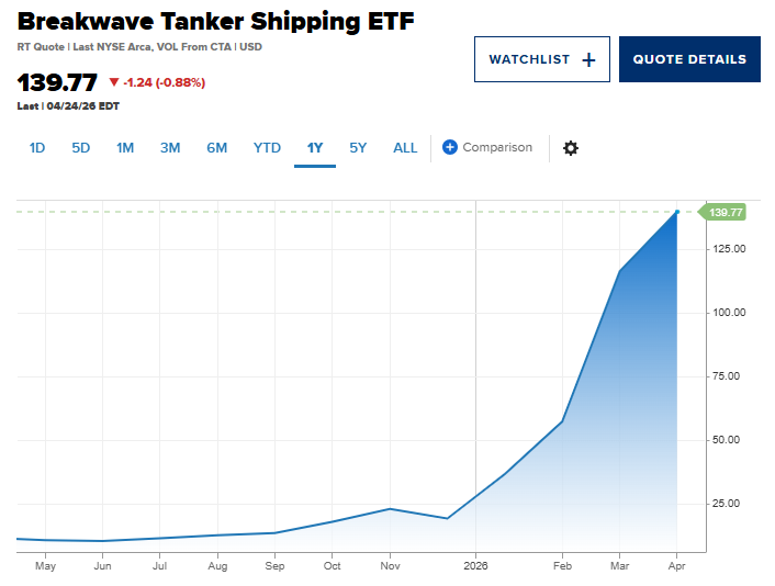 今年以来,油价大幅上涨。截至周五(4月24日),美国石油基金(USO)涨幅接近90%;能源股同样表现强劲,SPDR能源精选行业ETF(XLE)上涨超过23%。然而,与运费期货的飙升相比,这些涨幅似乎仍显逊色。事实上,BWET的上涨早在中东战争爆发前便已启动,过去一年累计涨幅超过1000%。